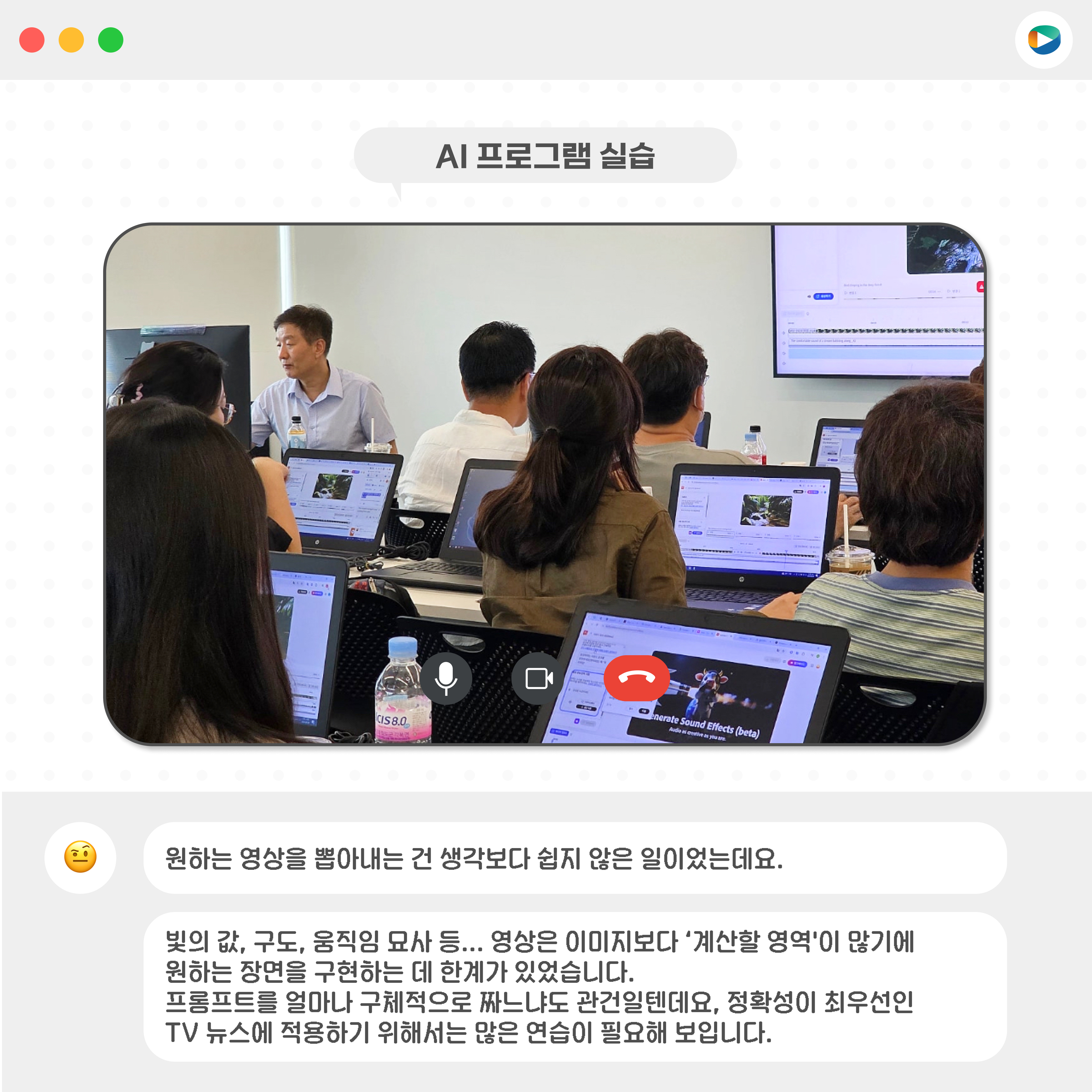 이번 과정에는 총 28명(1차 15명, 2차 13명)이 참여했으며, 김병환 강사님이 생성형 AI의 개념과 최신 동향, 그리고 영상편집 업무 프로세스에서 활용할 수 있는 다양한 프로그램들을 소개하는 시간을 가졌습니다.