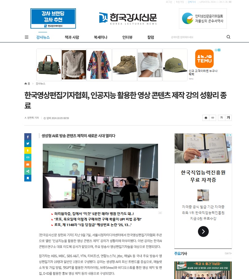 한국영상편집기자협회, 인공지능 활용한 영상 콘텐츠 제작 강의 성황리 종료 < 강사뉴스 < 기사본문 - 한국강사신문