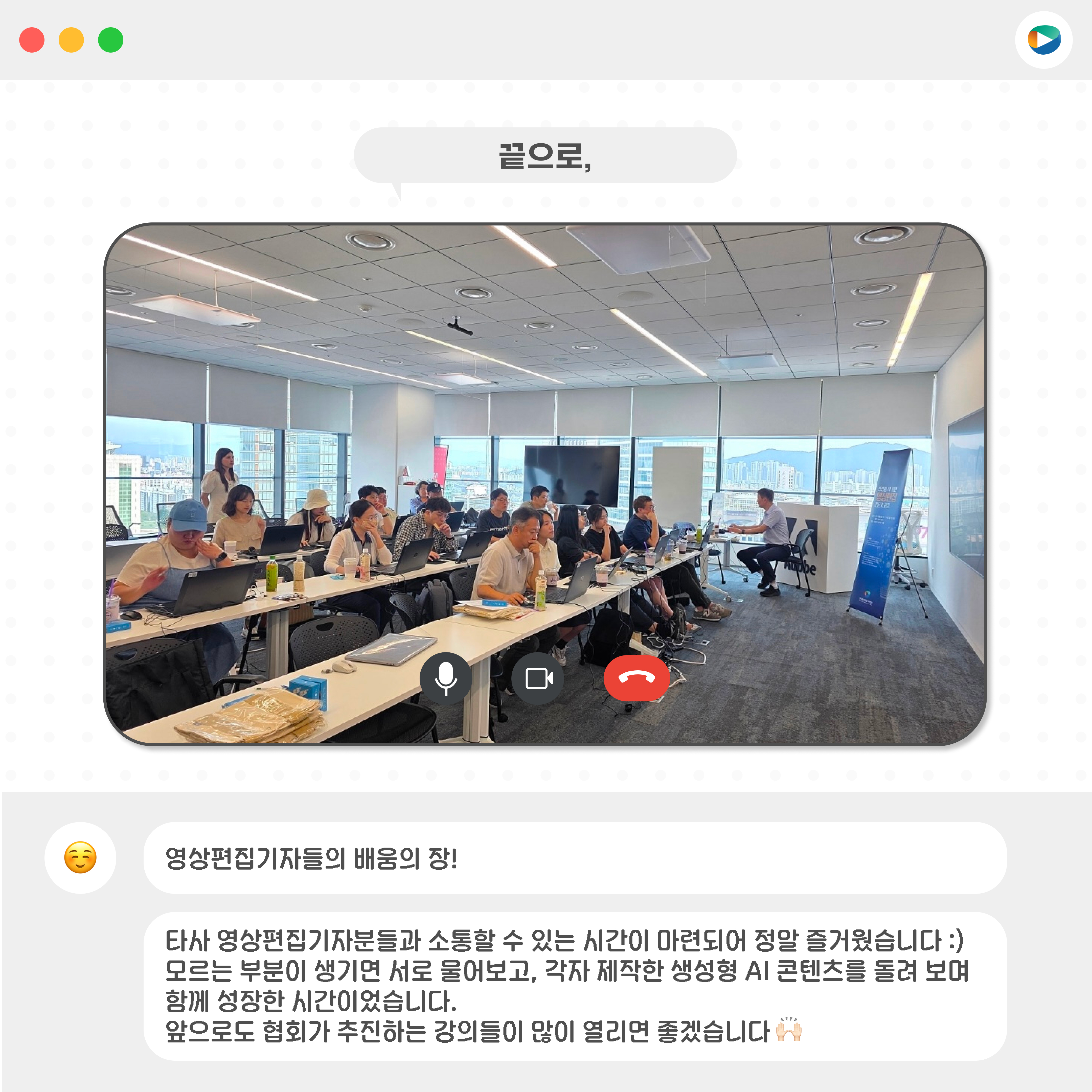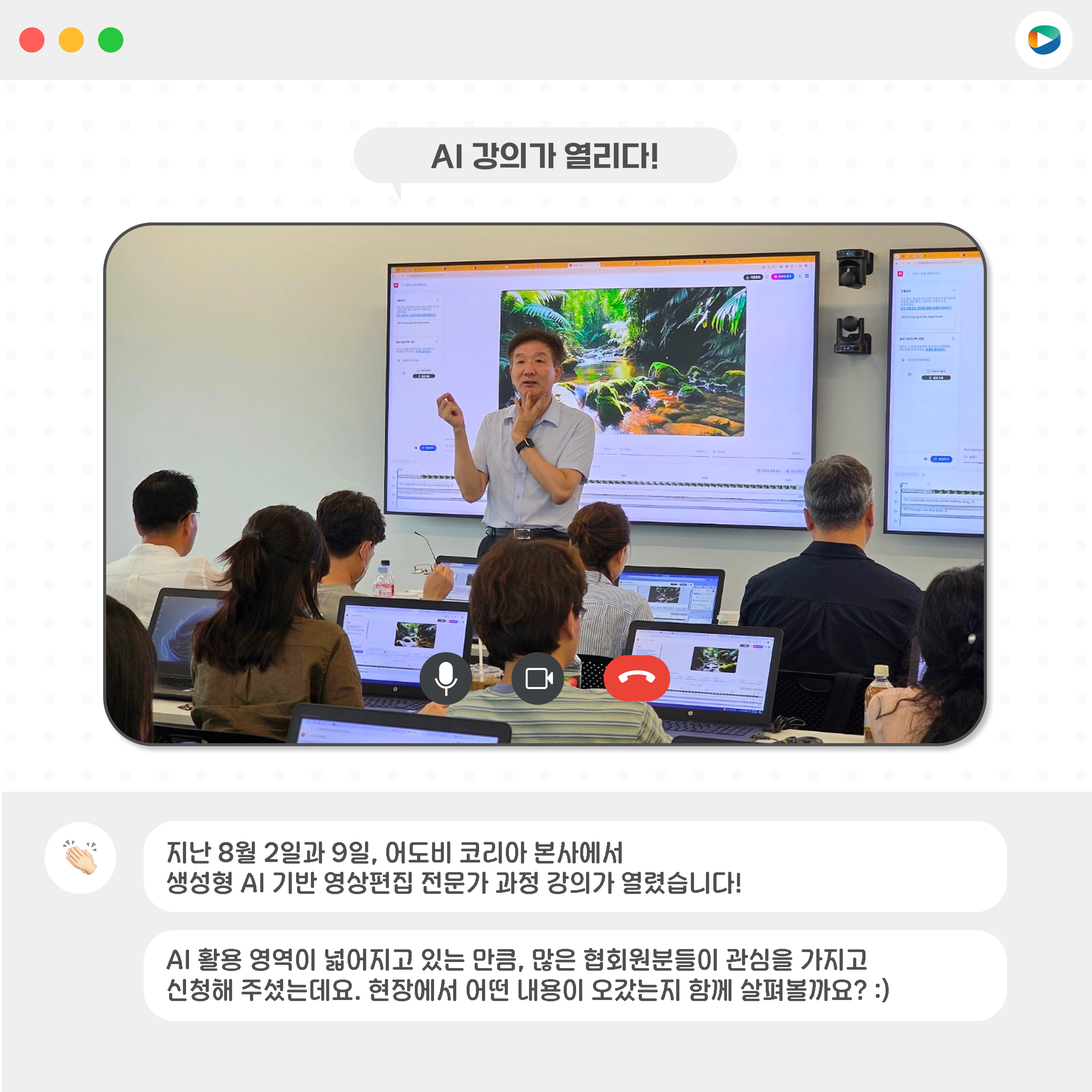 지난 8월 2일(토)과 9일(토), 양일간 어도비 코리아 강의실에서 「생성형 AI 기반 영상편집 전문가 과정」이 진행되었습니다.