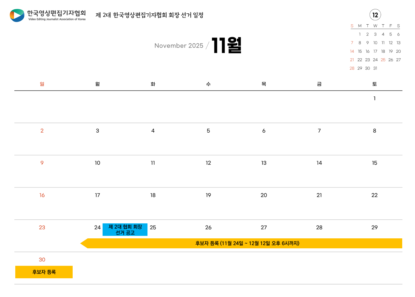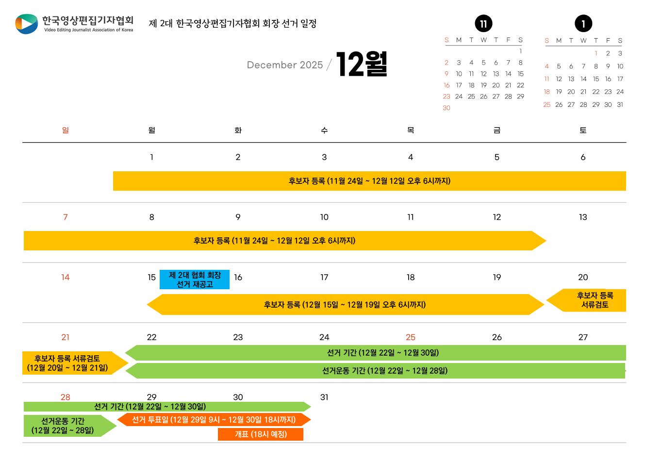 한국영상편집기자협회 선거관리위원회는 제2대 협회장 선거 재공고로 변경된 일정표를 다음과 같이 안내합니다.